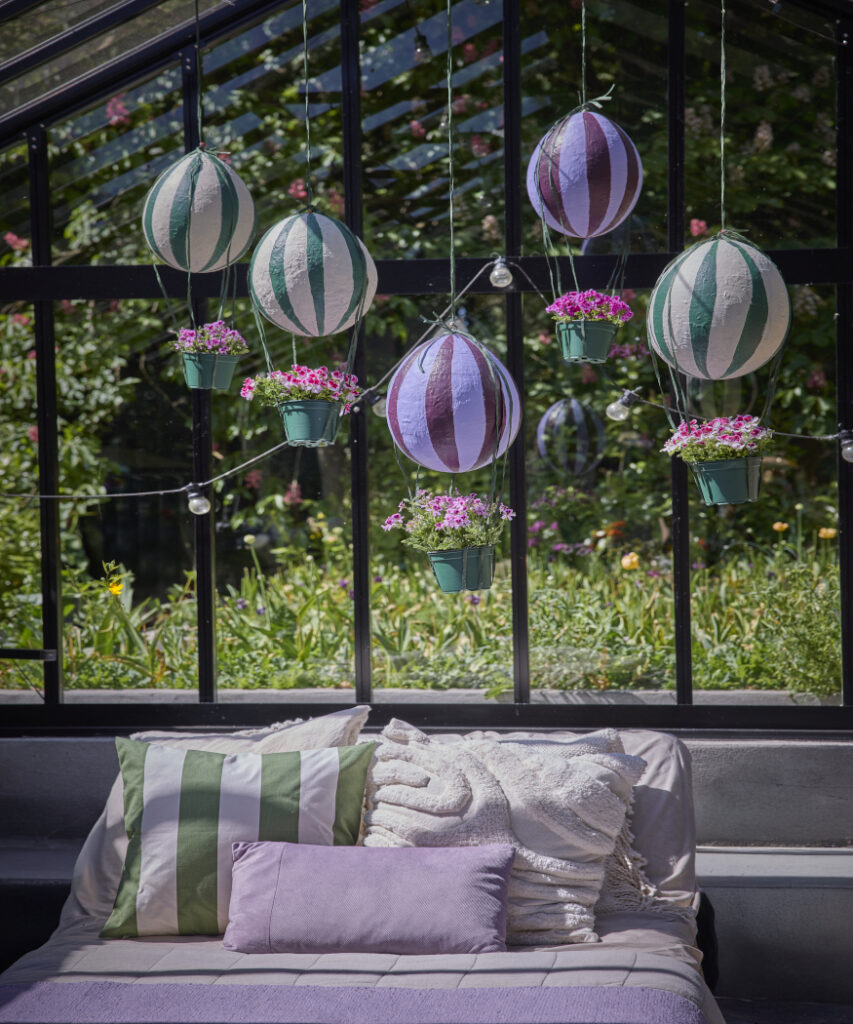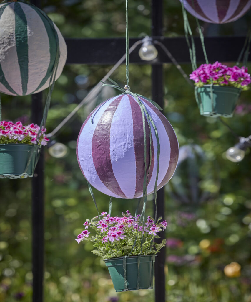 Si vous cherchez plus de légèreté, optez pour des pots suspendus aux formes aériennes, comme celles d’un ballon. Vous pouvez facilement les fabriquer vous-même, par exemple en papier mâché, et y fixer le géranium dans un panier (ou un petit pot) en-dessous. Choisissez un pot léger et utilisez un fil solide.