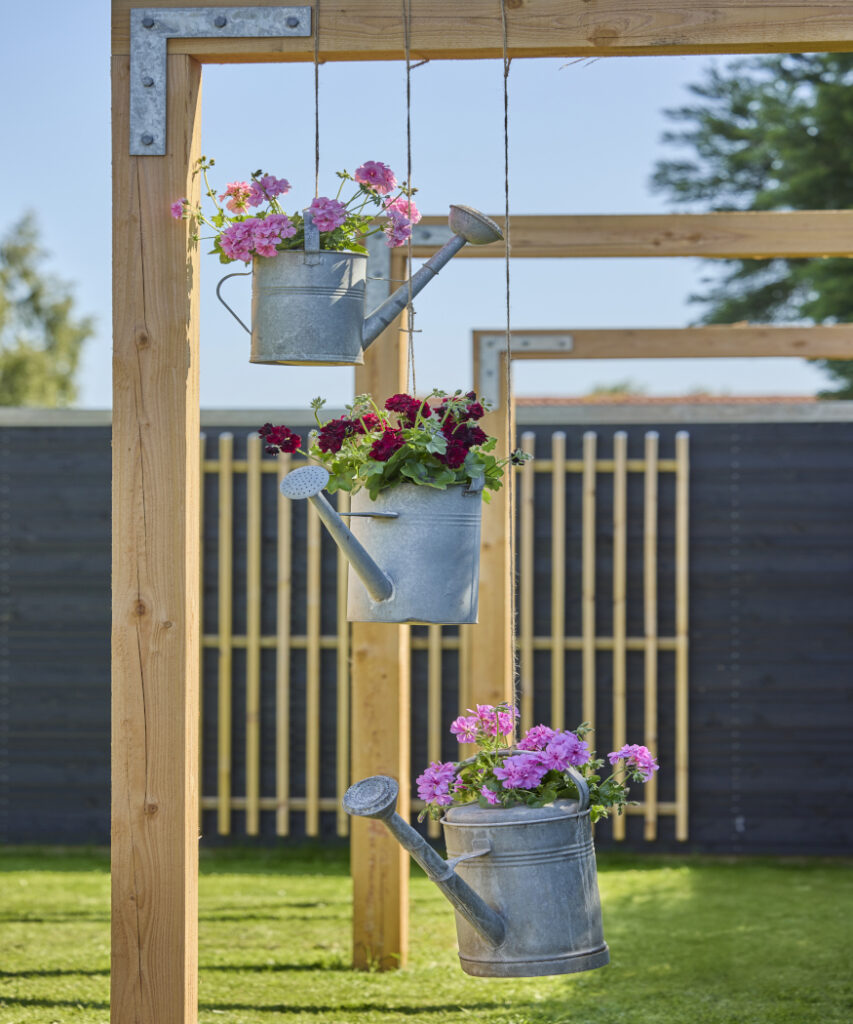 Vous pouvez transformer de vieux arrosoirs en pots suspendus originaux. Leur aspect robuste contraste joliment avec la douceur des fleurs des géraniums. Suspendez plusieurs arrosoirs en quinconce à un cadre en bois ou à une pergola pour créer davantage de profondeur. Percez des trous dans le fond pour assurer un bon drainage. Vous n’avez pas d’arrosoirs ? Soyez créatif, vous pouvez aussi utiliser des casseroles ou des pichets dont vous ne vous servez plus!