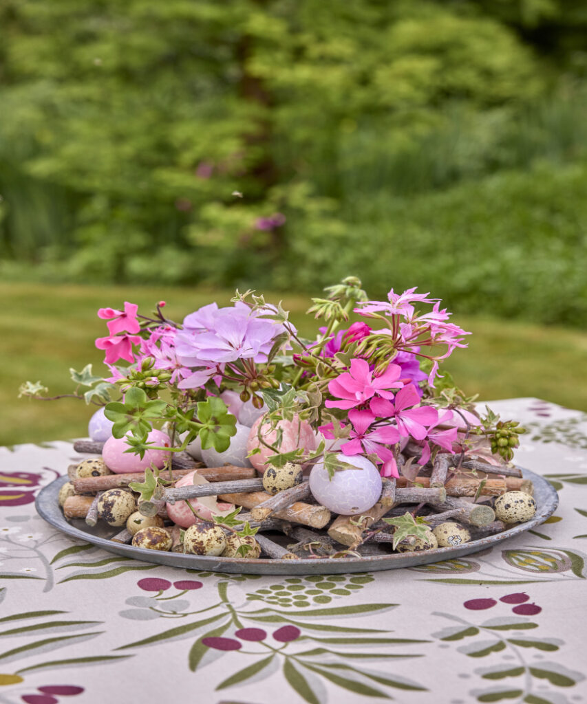 Une alternative créative à la traditionnelle couronne de Pâques : les coquilles d’œufs sont transformées en petits vases disposés sur un plateau et remplis de fleurs de géranium. Entourée de brindilles, de mousse et d’œufs de caille, cette décoration de table charmante allie l’aspect naturel et rustique aux fleurs printanières, et peut être réalisée en un rien de temps.