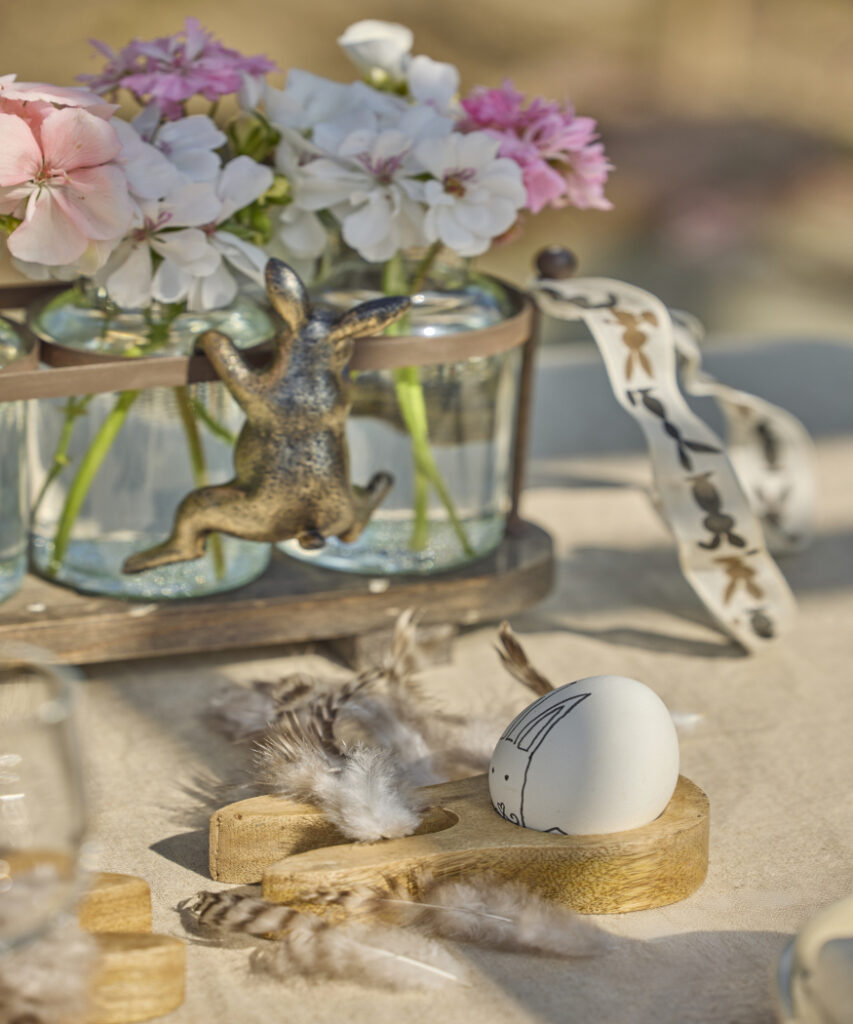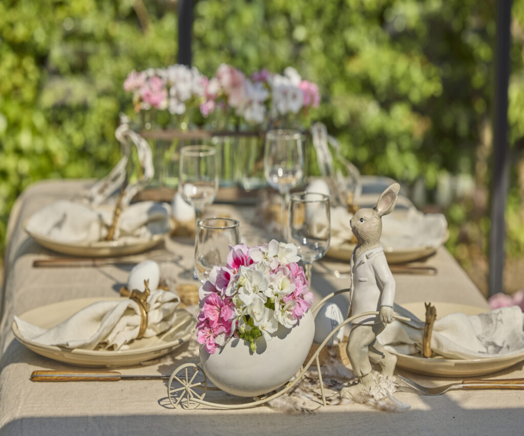 Des œufs décorés artistiquement, des coussins doux aux motifs de Pâques, des coquetiers en bois en forme de tête de lapin et des ronds de serviette élégants, ornés de petits lapins, viennent compléter cette jolie mise en scène. Un élément charmant est la figurine de lapin poussant une brouette remplie de géraniums blancs et roses, qui ne manquera pas d’attirer tous les regards.