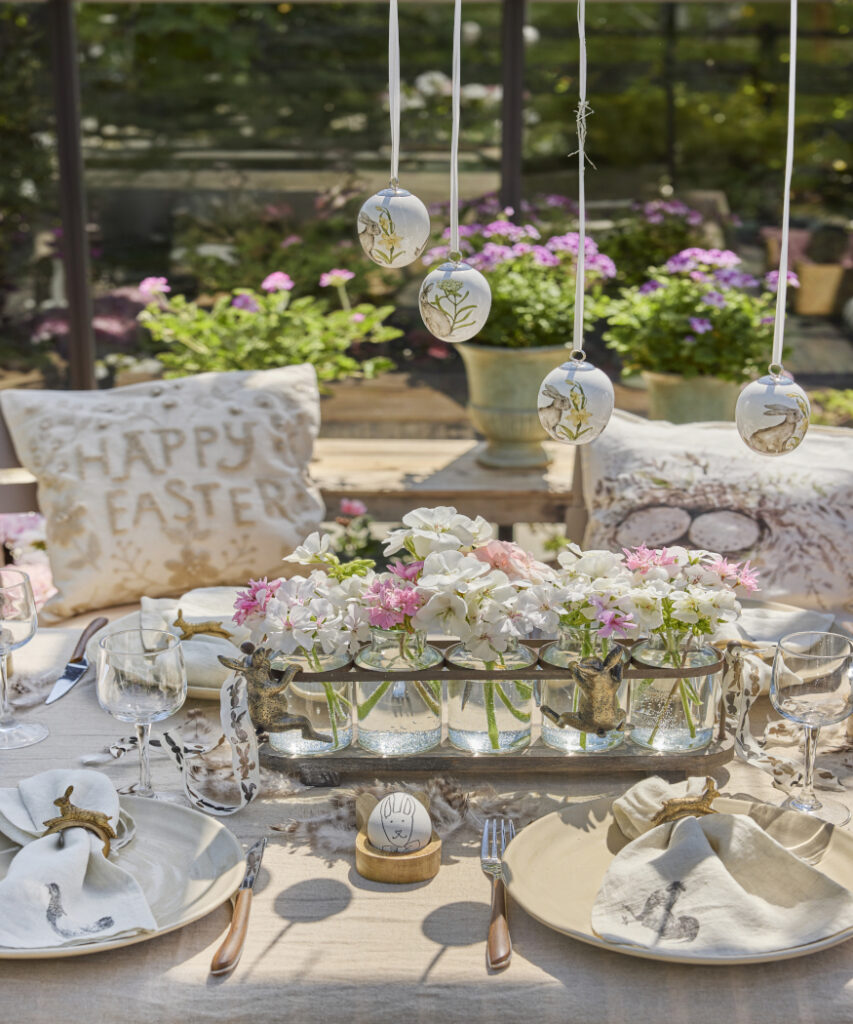 De luxuriantes fleurs de géranium aux teintes abricot, rose et blanche remplissent cinq vases en verre, disposés dans un porte-vases en métal décoré de lapins de Pâques. Cela crée un point d’attention romantique sur cette table extérieure dressée de manière festive.